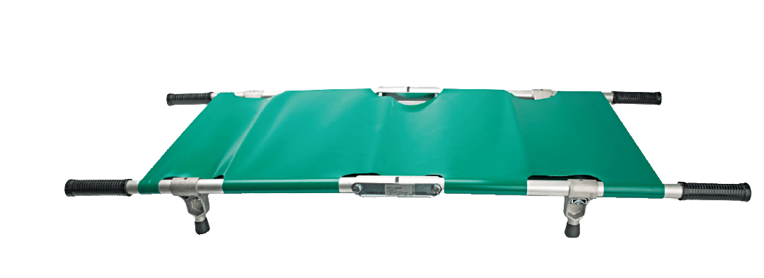 Składane nosze z aluminiowymi nóżkami i rączkami, wykonane z nieprzemakalnego i nierwącego się PCV.